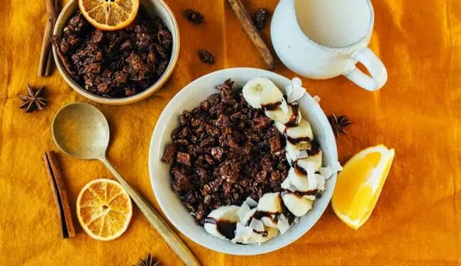 Haferflocken (glutenfrei), Kakao, Kokosnussflocken, getrocknete Apfelringe, Lebkuchengewürz, Orangenschale, Salz, Pekannüsse, Ahornsirup, Mandelmus und Melasse. Kräftig vermischen und dann ab in den Backofen.