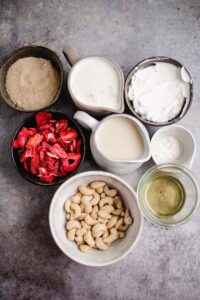 Die Herstellung ist einfach und unkompliziert, vor allem wenn du im Besitz einer Eismaschine bist. Als ersten Schritt schneide ich die getrockneten Erdbeeren in kleinere Stücke und lege sie beiseite. Jetzt wird die Basis für das Eis hergestellt aus Pflanzenmilch, pflanzlicher Sahne, Rohrohrzucker, Agavensirup, Cashews, pflanzlichem Joghurt und Xanthan Gum.