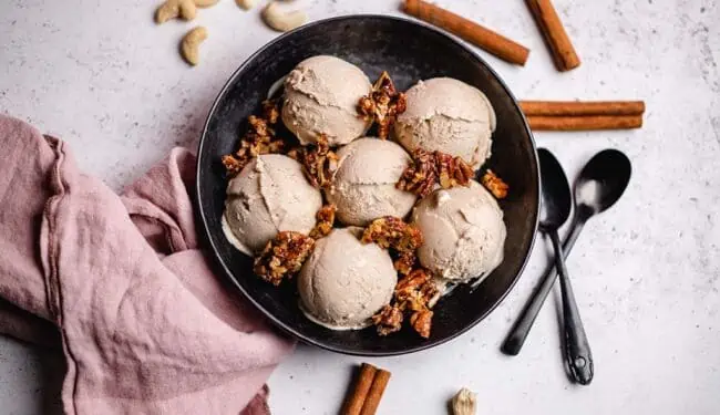 Veganes Zimteis mit karamellisierten Pekannüssen